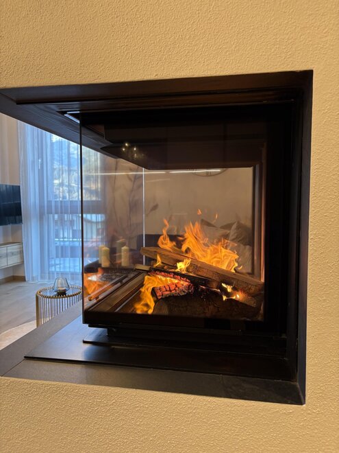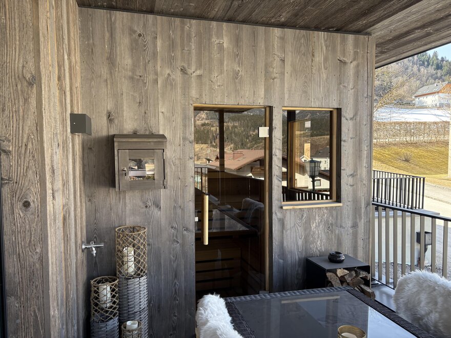 einen offenen Kamin für gemütliche Abende sowie eine private Außensauna auf der Terrasse .